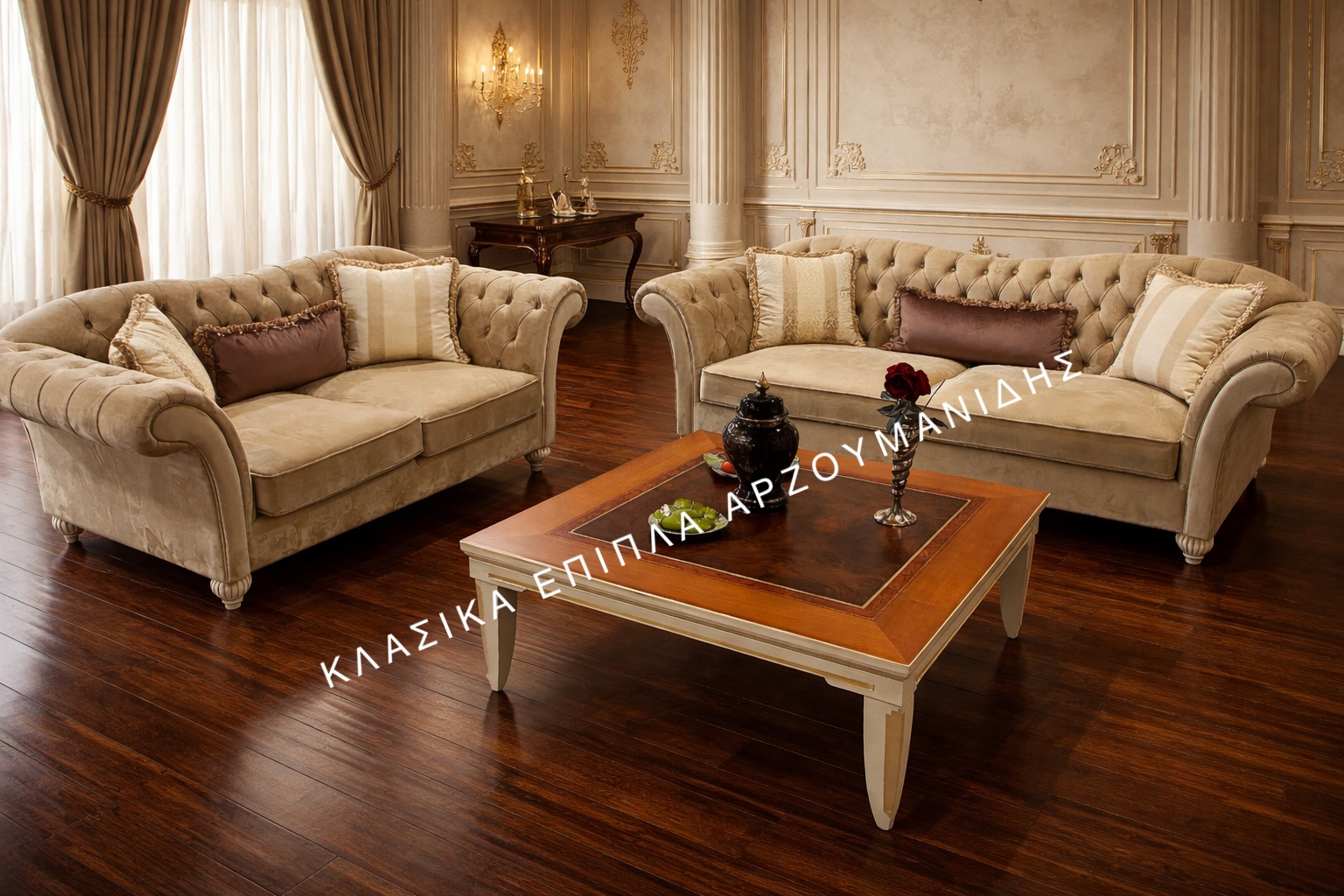 Κλασικó σαλόνι.Διατíθεται σε τριθέσιο και διθέσιο με πολλές επιλογές υφασμάτων.