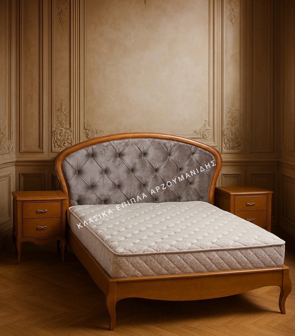 Κλασική χειροποίητη κρεβατοκάμαρα που αποτελείται από κρεβάτι δύο κομοδίνα τουαλέτα και καθρέπτη.Κλασικά Έπιπλα Αρζουμανίδης.