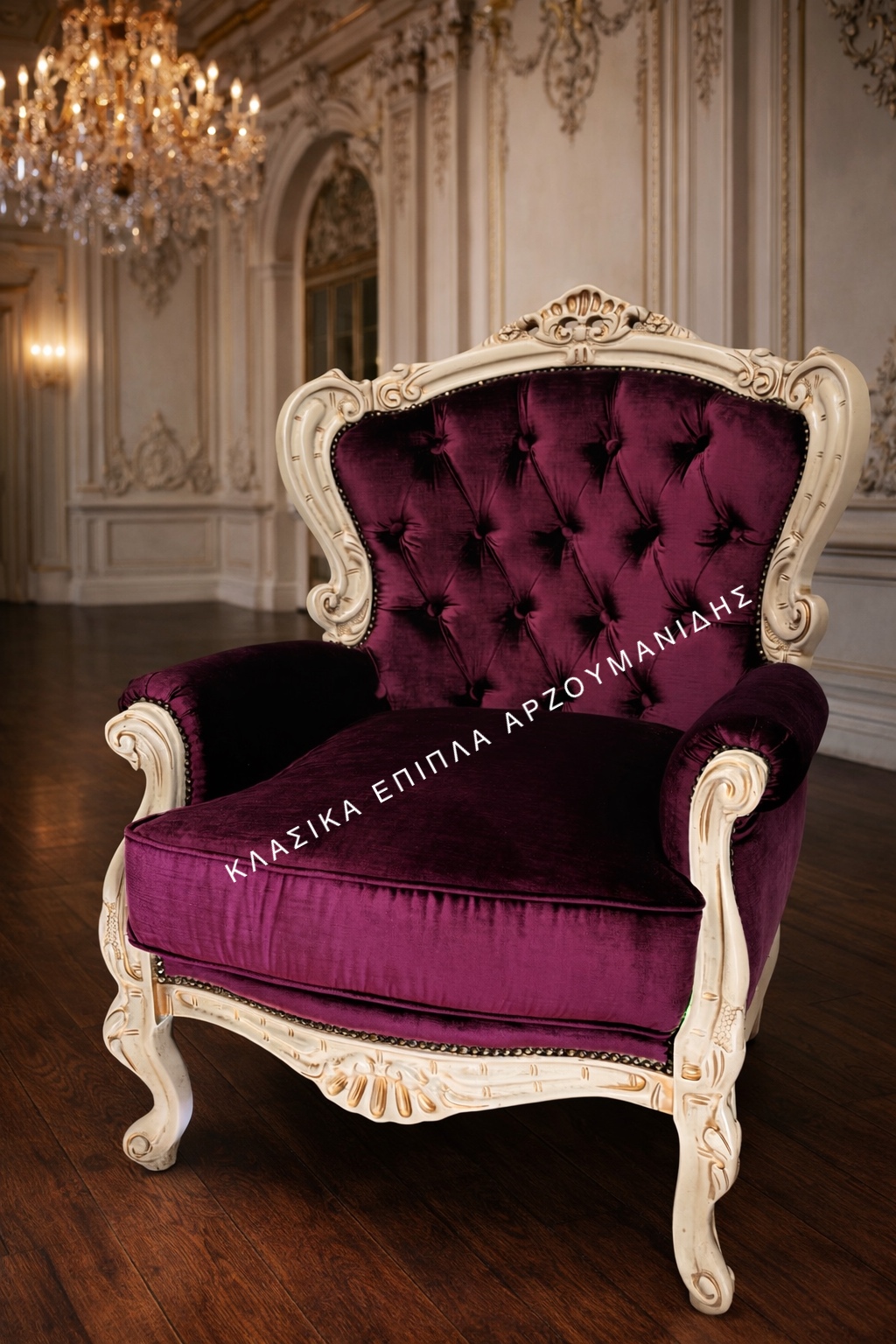 Κλασική χειροποίητη πολυθρόνα σε προσφορά τιμή 1100 € + Φ.Π.Α. Η τιμή αφορά το εκθεσιακό κομμάτι. Κατασκευάζεται στην απόχρωση και στα υφάσματα που επιθυμείτε