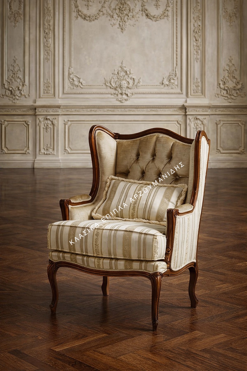 Κλασική πολυθρόνα  κατασκευασμένη από μασίφ ξύλο οξυάς διαθέσιμη σε πολλά χρώματα και υφάσματα.
