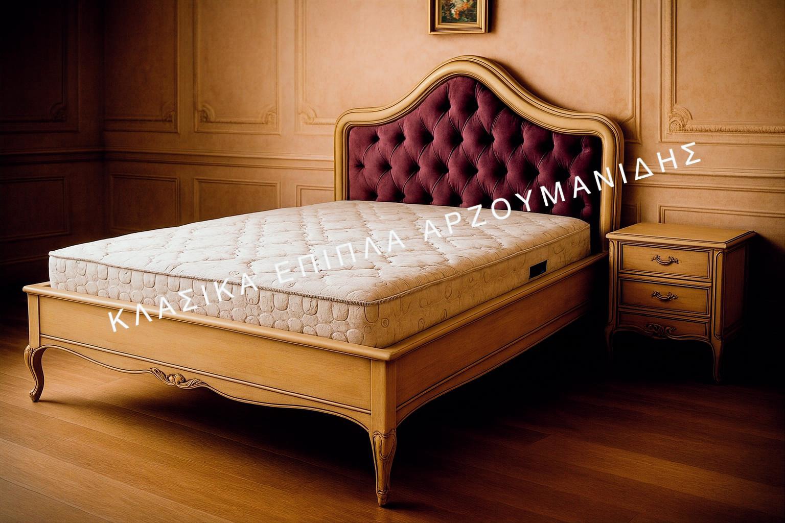 Κλασική χειροποίητη κρεβατοκάμαρα που αποτελείται από κρεβάτι δύο κομοδίνα τουαλέτα και καθρέπτη.Κλασικά Έπιπλα Αρζουμανίδης.